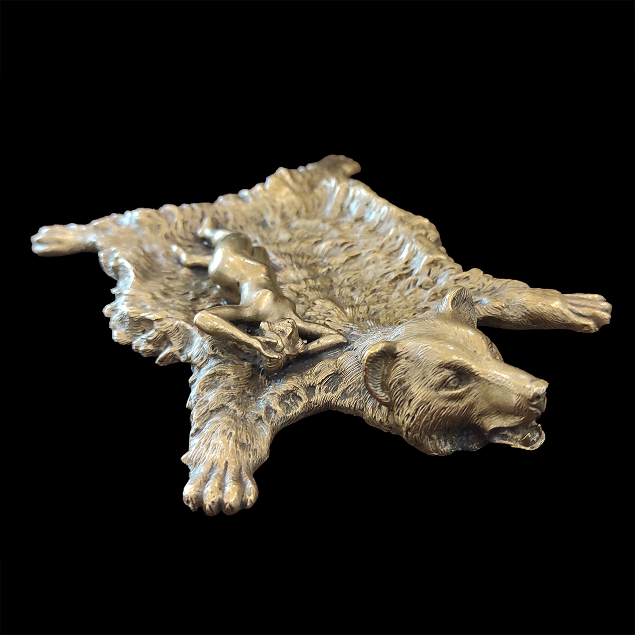 Pieza que simula piel de oso de bronce con una figura femenina sobre ella, época victoriana o Belle Époque, segunda mitad del siglo XIX.