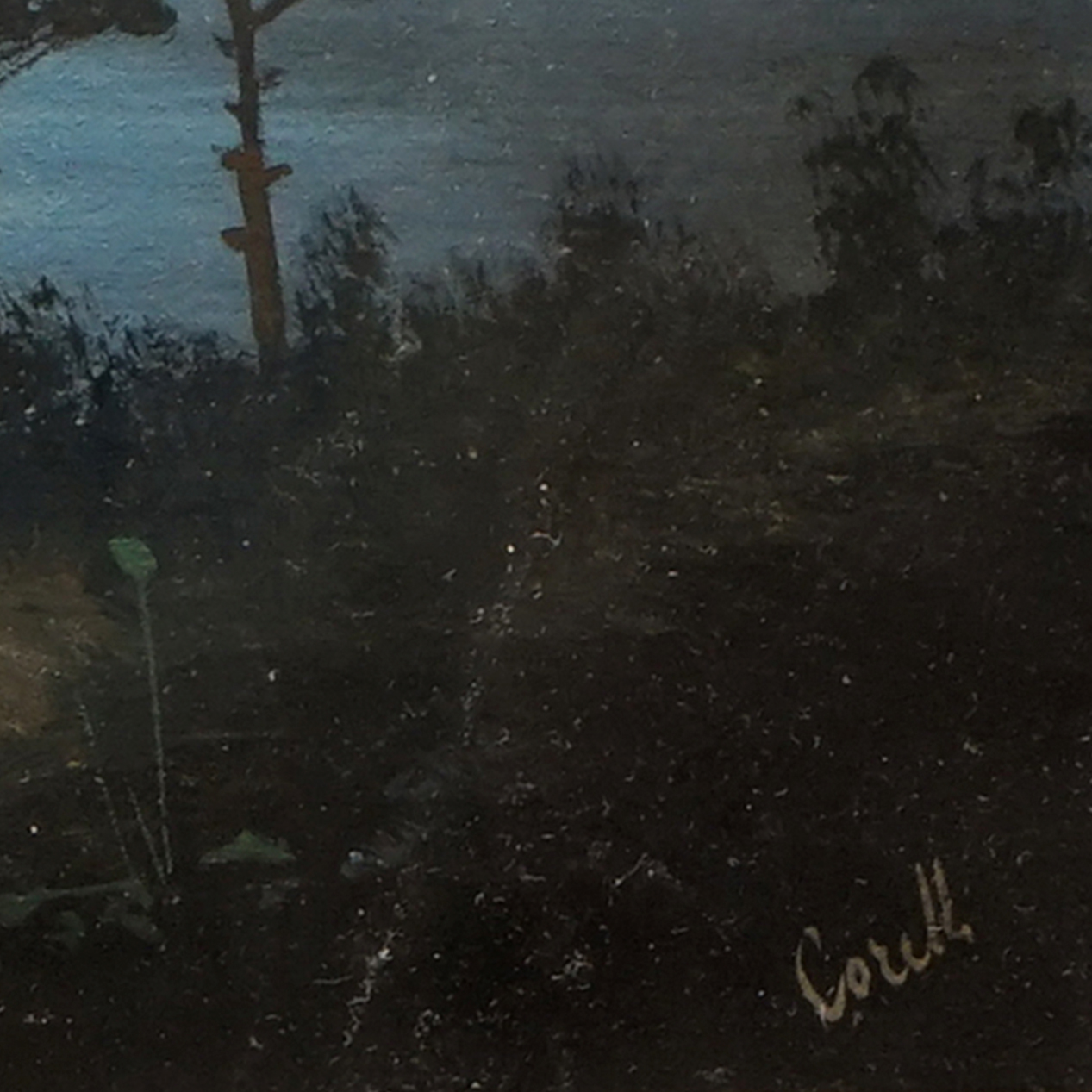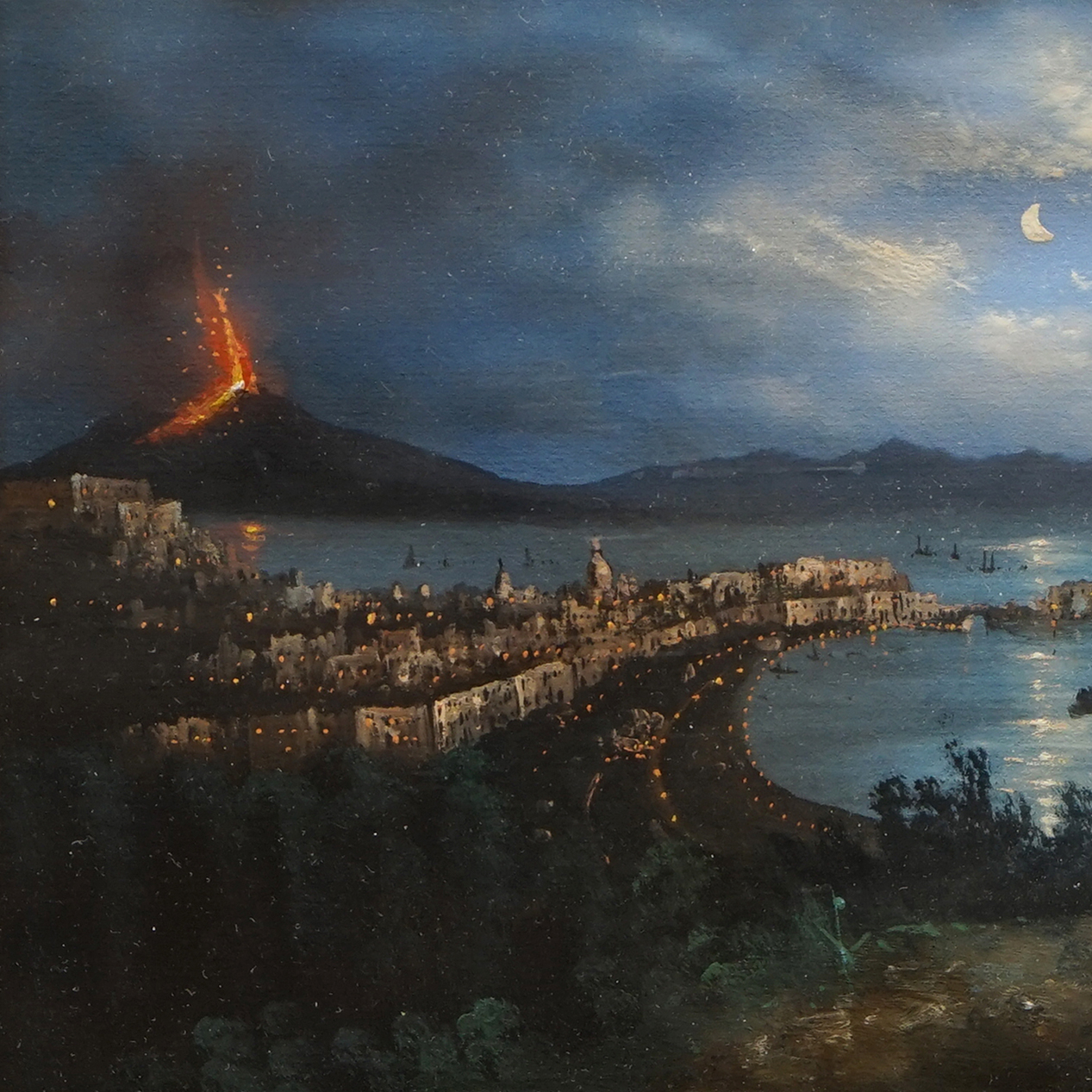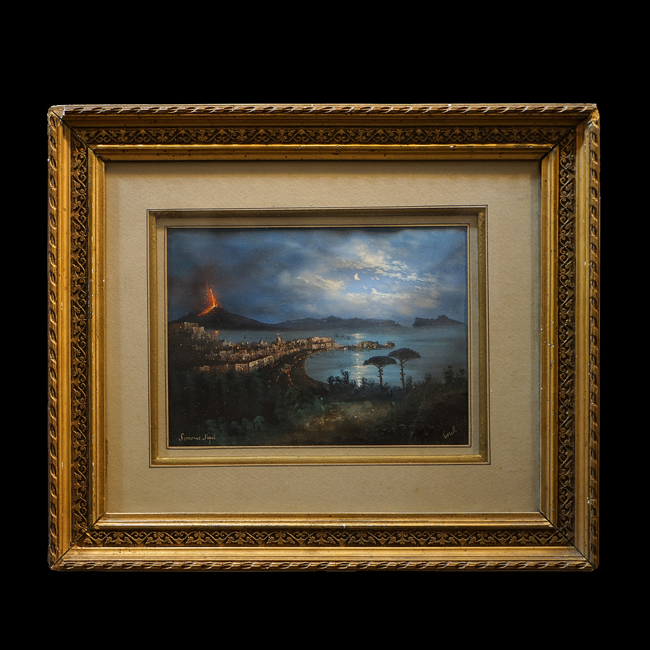 Marina italiana del puerto de Nápoles, con el volcán Vesubio en erupción; firmado por «Corell»