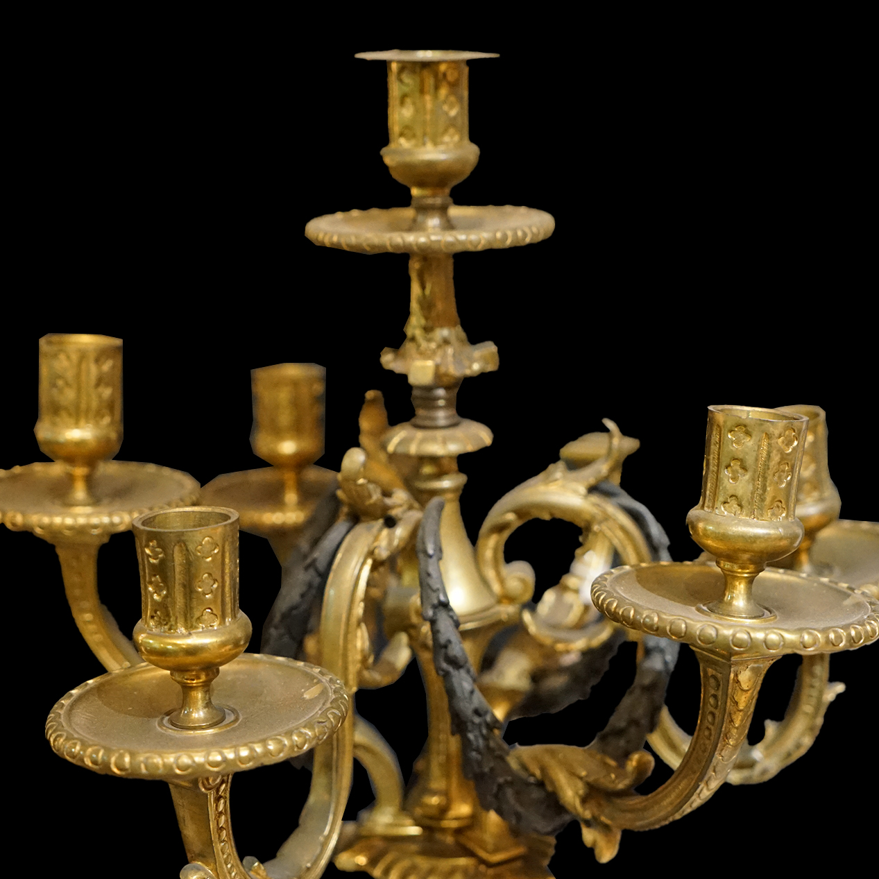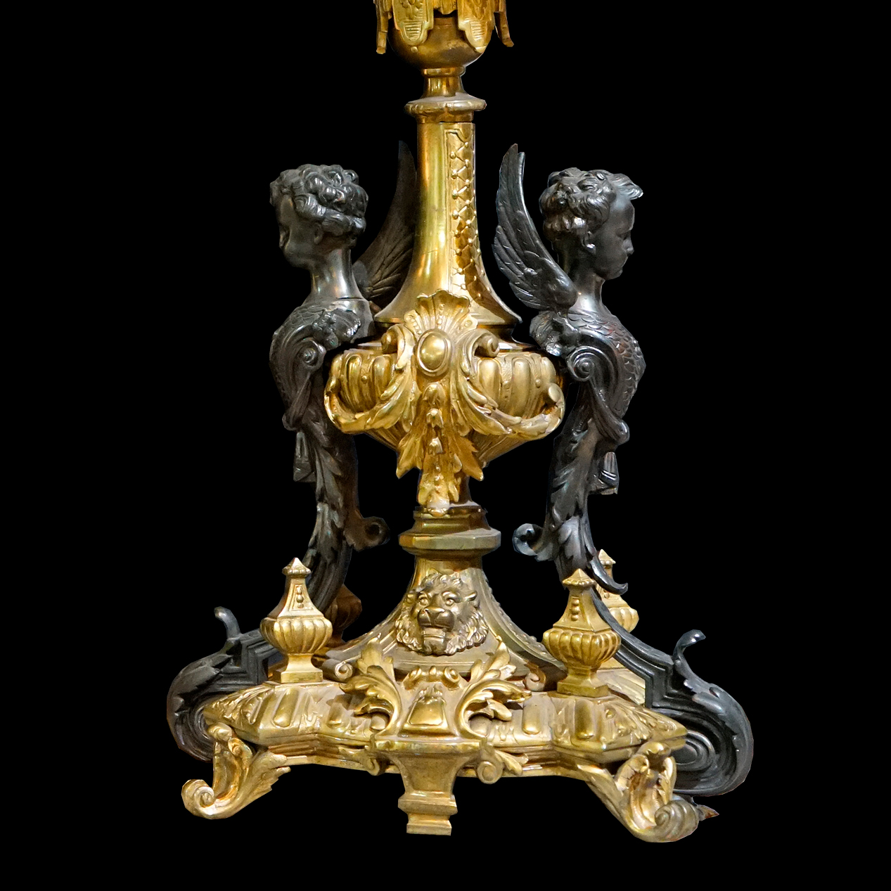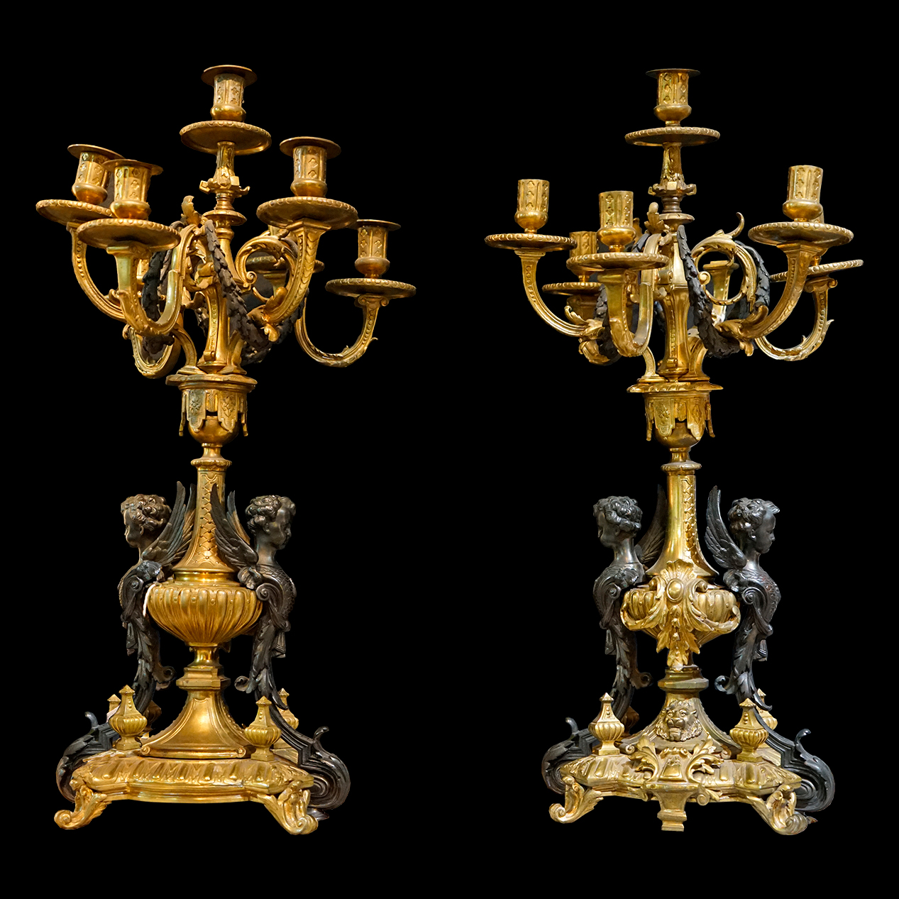 Pareja de candelabros franceses de bronce con un par de figuras aladas.